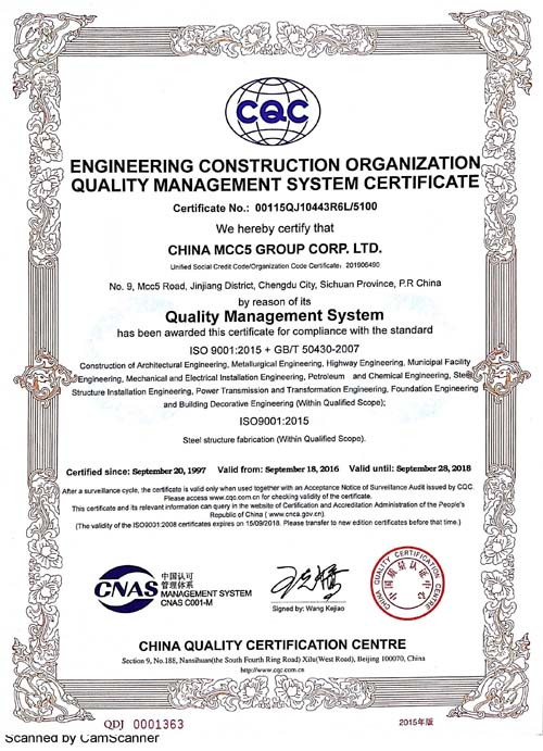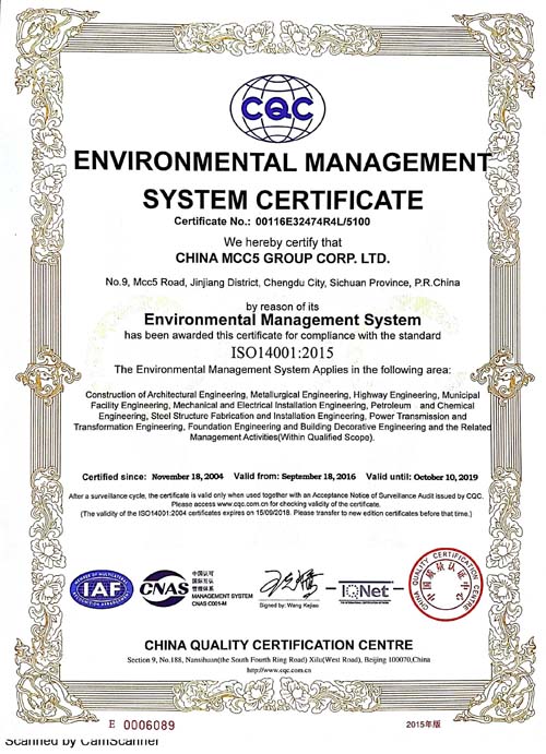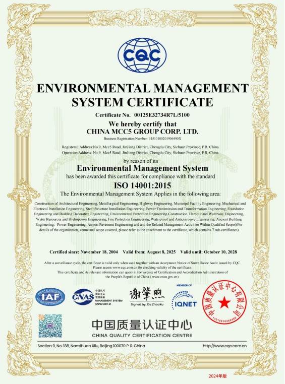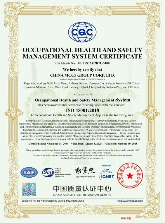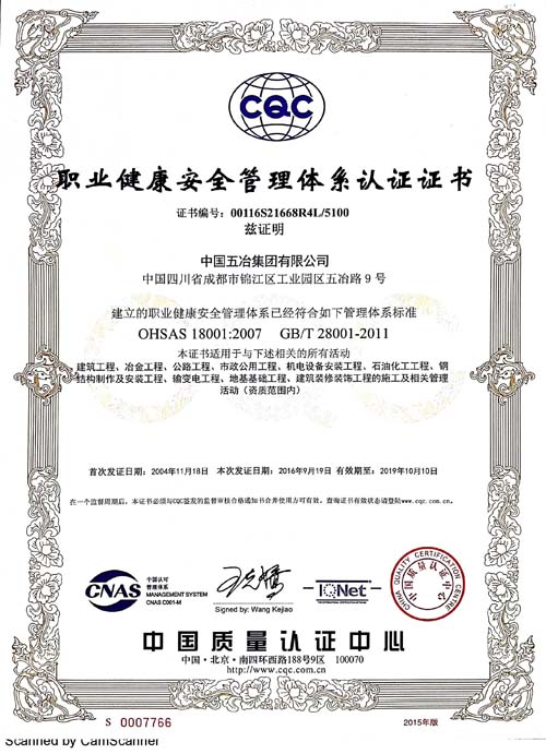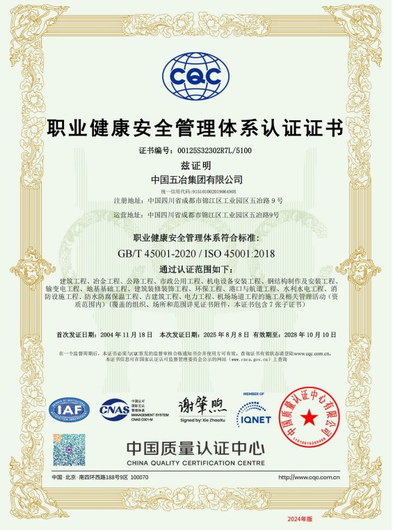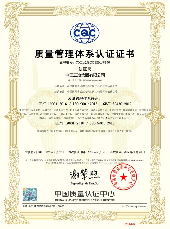 中國五冶集團有限公司(以下簡稱中國五冶集團),1997年通過ISO9000質量體系認證。2004年,中國五冶集團按照ISO9001、ISO14001、OHSAS18001國際標準要求,建立質量環境職業健康安全整合型管理體系并通過三標一體認證。2011年,中國五冶集團按照GB/T50430-2007《工程建設施工企業質量管理規范》要求,建立并通過質量環境職業健康質量管理規范的三標一規范體系認證,至今保持三標一規范管理體系連續、平穩和協調運行。